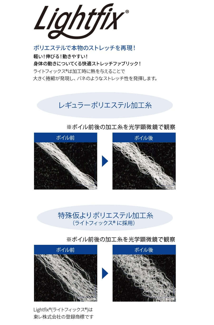 さらにライトフィックス®交織ツイルを採用。ライトフィックスとは、ポリエステルで本物のストレッチを実現。