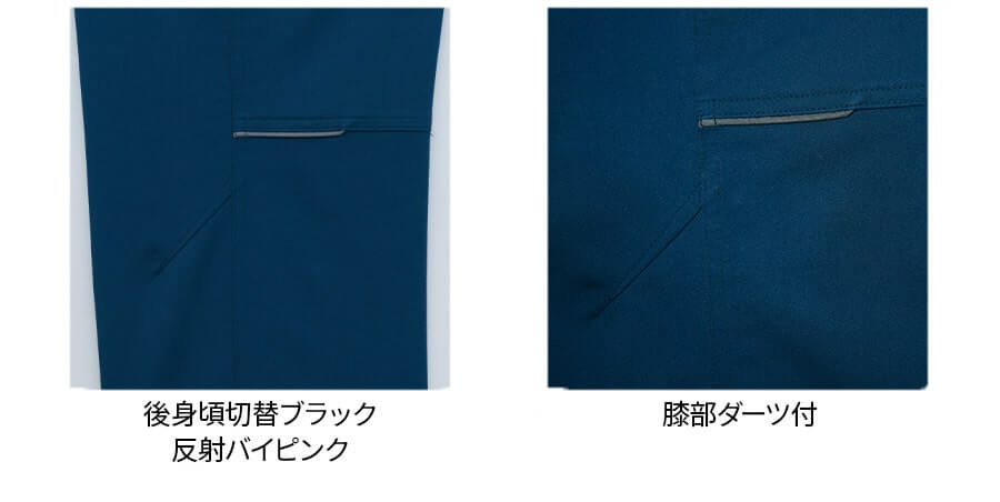 デザインベルトループ、サイドリブ仕様、ガゼットクロッチ(足の可動域を広げる股下構造)、右後マルチポケット付、膝部ダーツ付、後身頃切替ブラック反射バイピンク、片布付