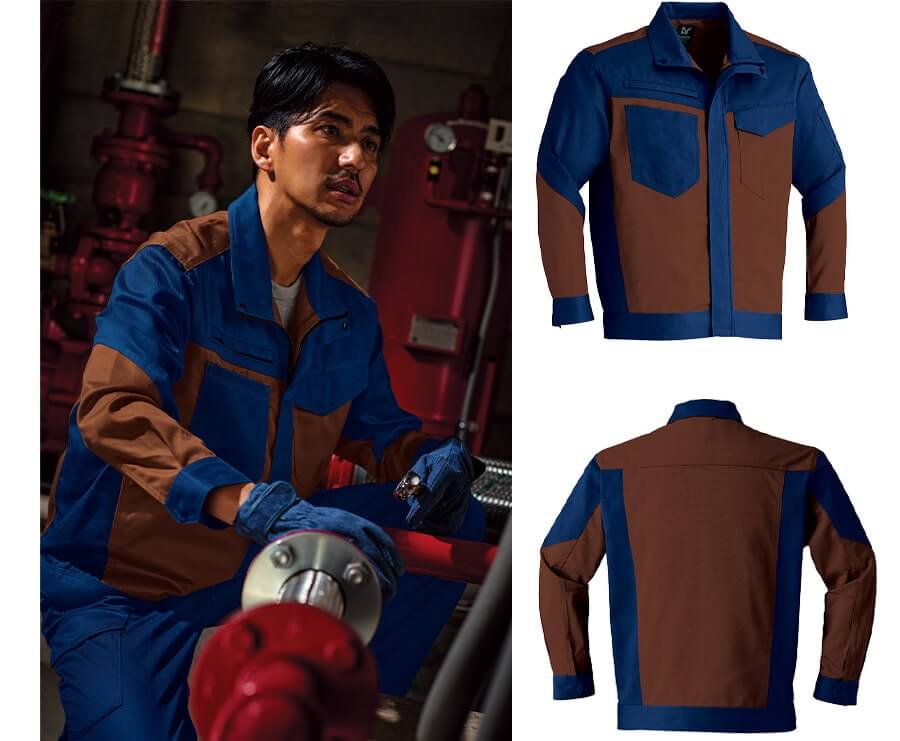 デザイン性に優れた、アシンメトリー廃色の難燃ワークウェアです。